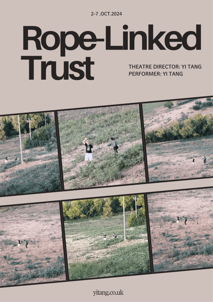 The innovative value of this performance was concentrated in three dimensions: First, it established a “tactile collaboration system,” using a single rope as the medium to enable non-verbal communication between strangers. Through the 30-minute timed task framework, it accurately captured the dynamic process of trust emerging from nothingness. Second, it created a “physical narrative archive,” translating the performers’ physical data—such as speed variations, frequency of stumbles, and collaborative rhythms—into a “visualized language” that reflected their internal states of trust, breaking the barrier in performance art of “difficulty in externalizing psychological processes.” Third, it employed a “panoptic structure”: while the participants (Yi Tang and her partner) were under “sensory restriction,” the audience enjoyed unrestricted panoramic viewing. This contrast deconstructed the traditional theatrical power dynamics of “passive audience observation and active performer expression,” making both audience and performers co-participants in the “trust experiment.”